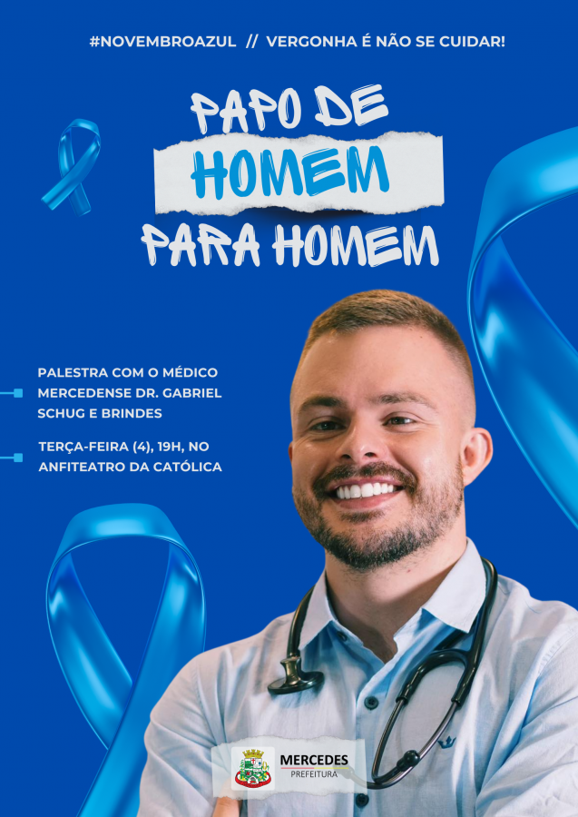 Em alusão ao Novembro Azul, mês voltado à conscientização sobre a saúde do homem, a Secretaria de Saúde de Mercedes realiza nesta terça-feira (04), às 19h, no anfiteatro da Católica, a palestra “Papo de Homem para Homem”, conduzida pelo médico mercedense Dr. Gabriel Schug.