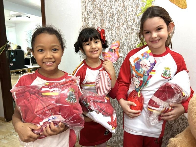 com uniformes iguais, de qualidade, e ainda levam um ovo de Páscoa. Para