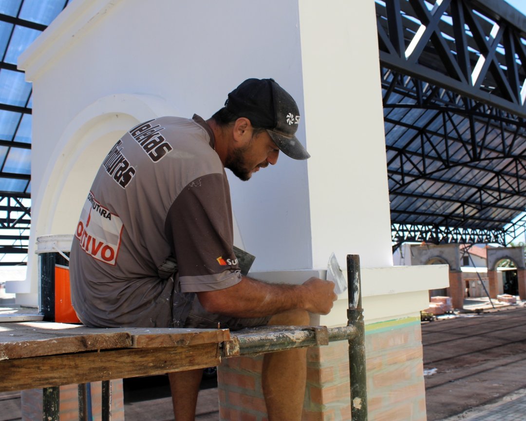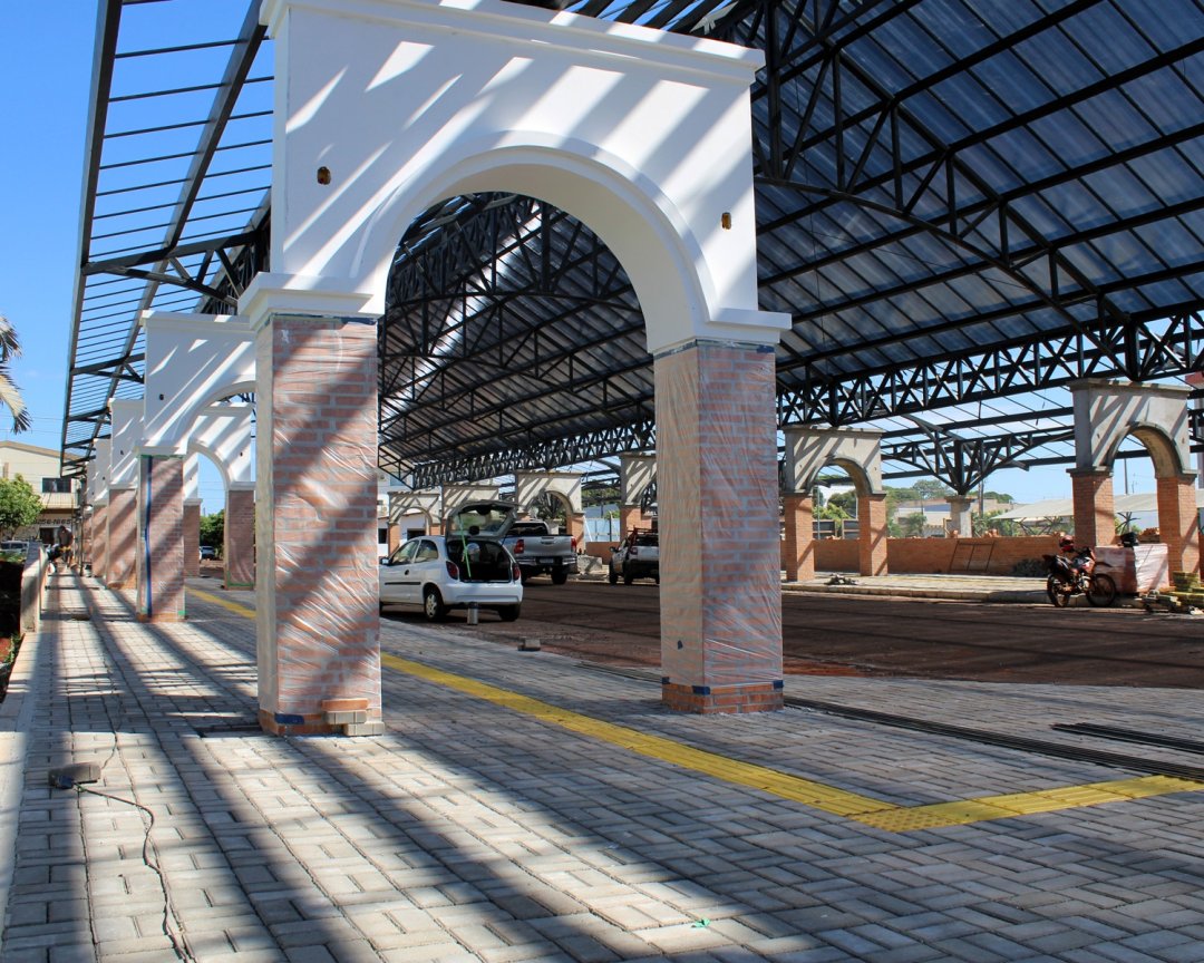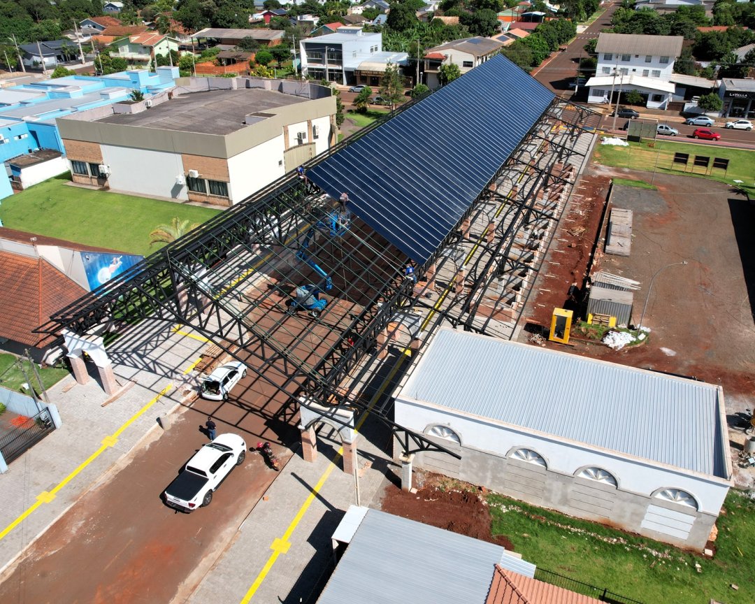 Além da cobertura, a obra avança em diversas frentes de acabamento. Está em andamento a instalação dos tijolos maciços aparentes, o calfinamento das estruturas para posterior pintura, bem como a instalação do sistema de para-raios e da rede elétrica. Já nos próximos dias, o local deverá receber a capa asfáltica, etapa importante para a finalização da infraestrutura.